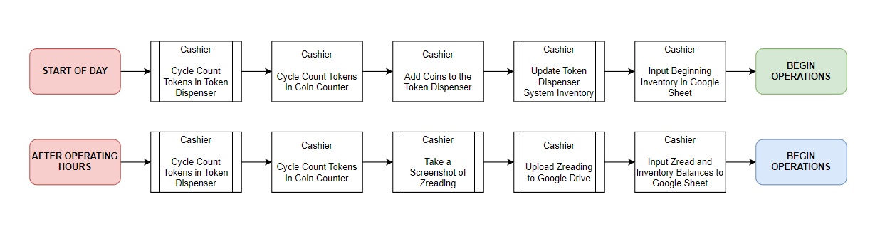 - Cashiers will record the starting token inventory every Start of Day, and ending token inventory every End of Day.